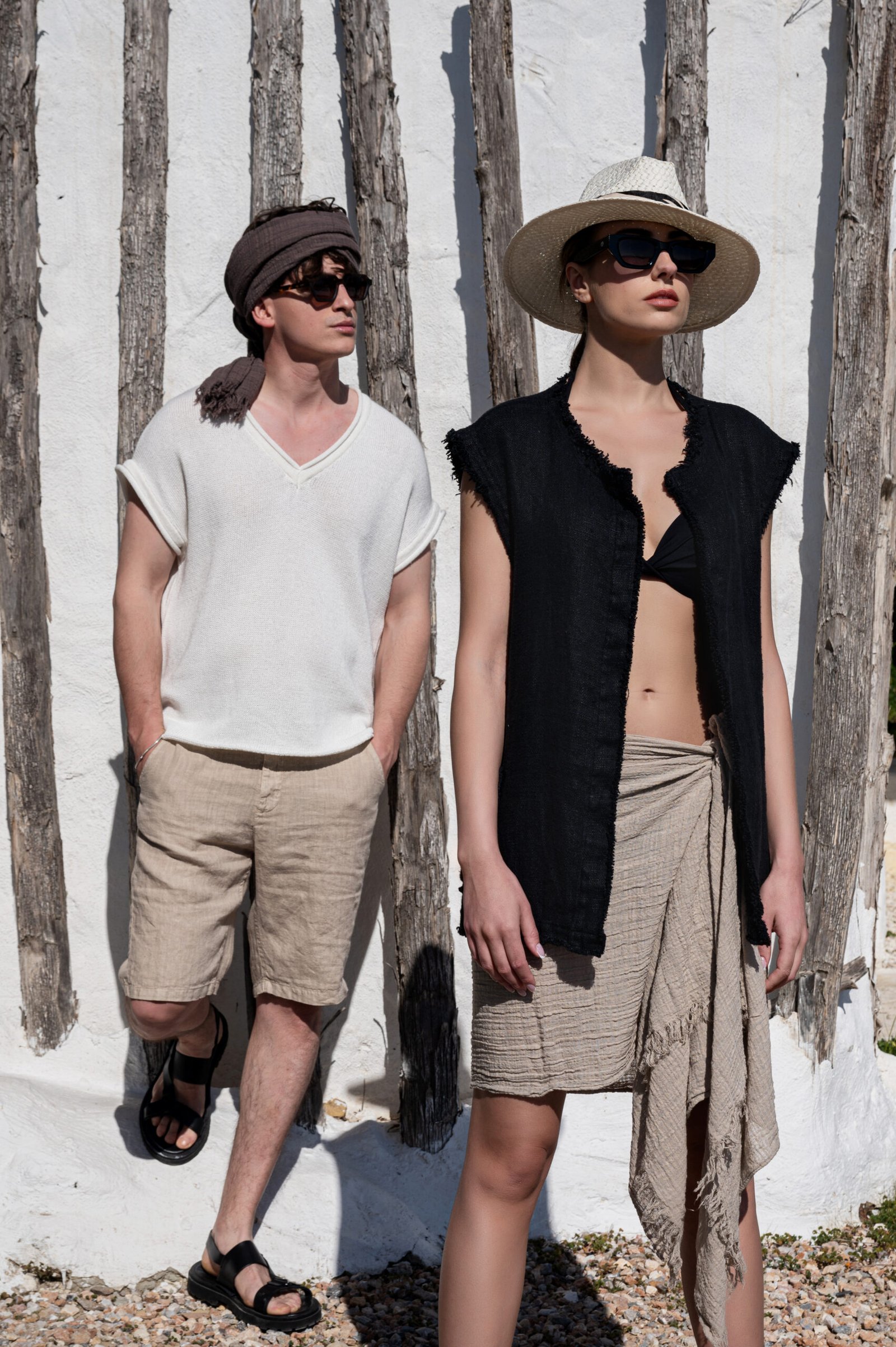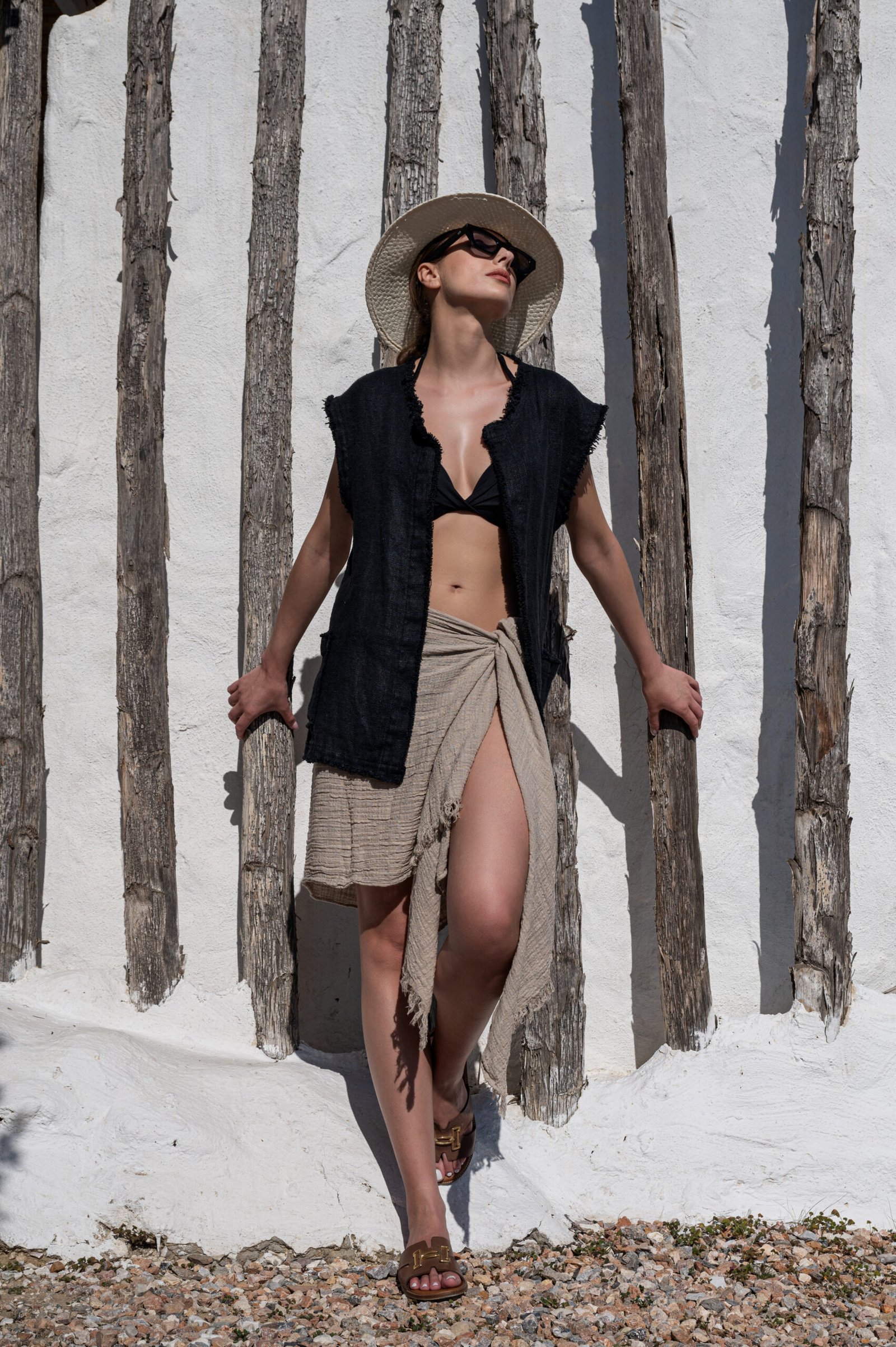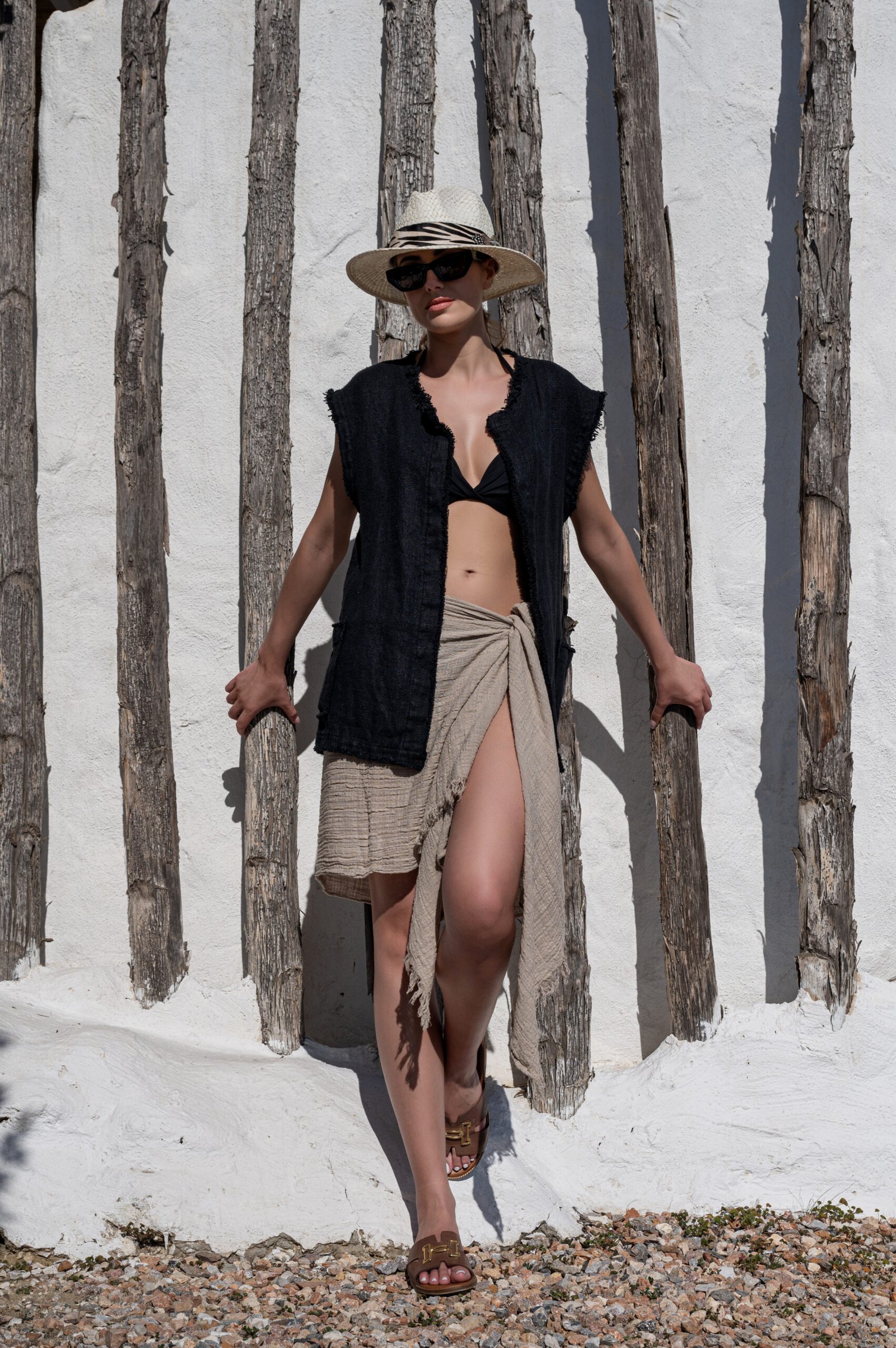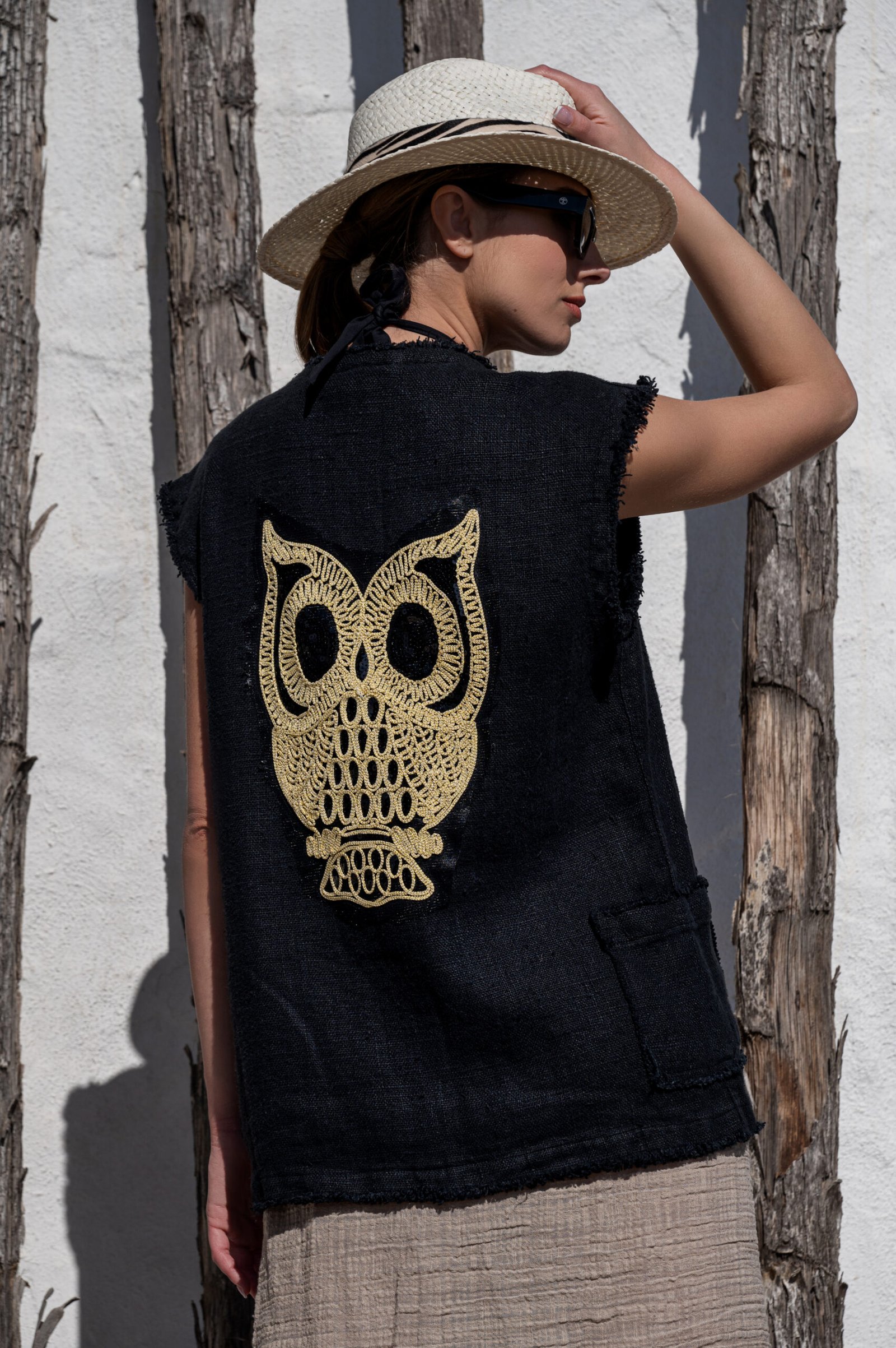 This unisex vest features a loose, sleeveless silhouette designed for effortless layering. Crafted from lightweight fabric, it is finished with a bold owl motif on the back that adds a distinctive character. Ideal to wear over tops or swimwear, it offers comfort and standout style for summer, beach days, and casual looks.