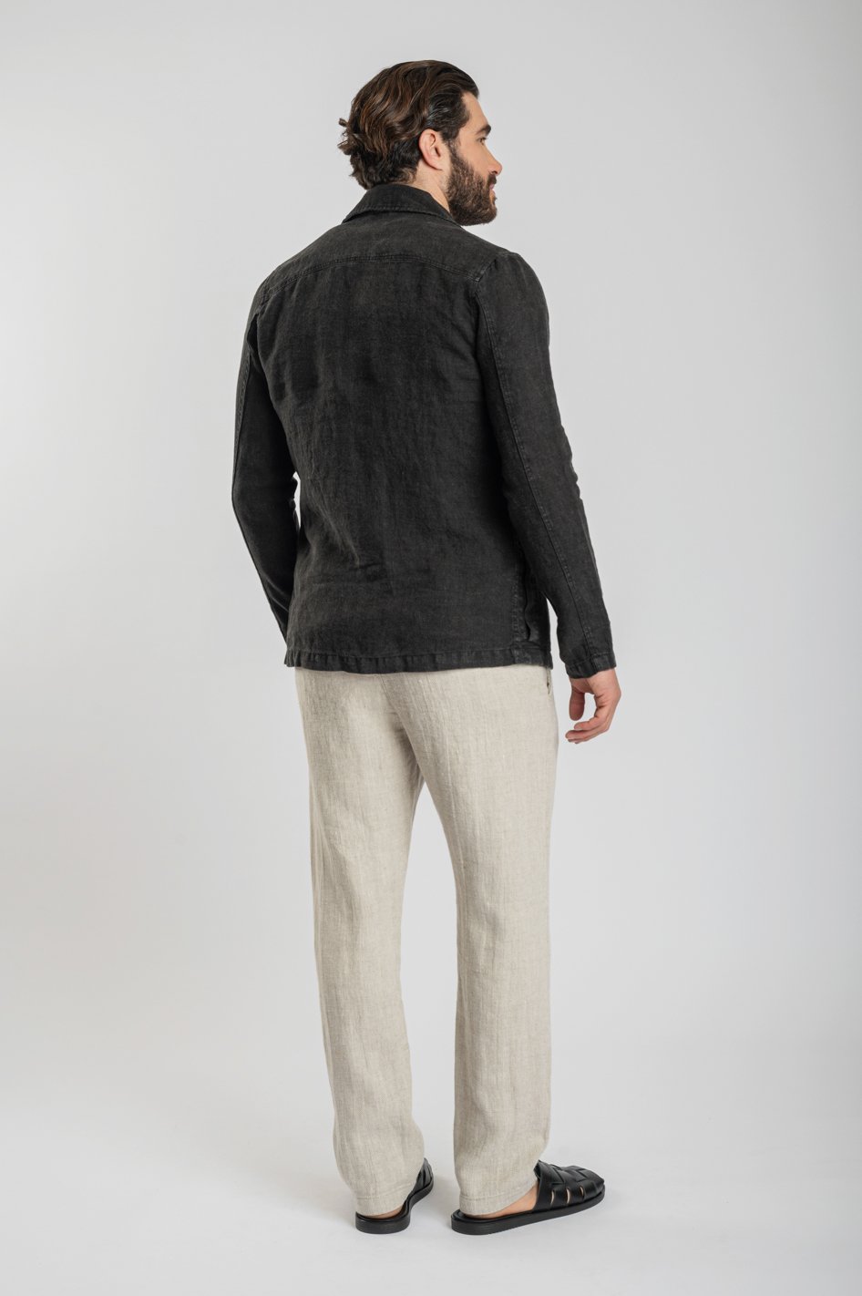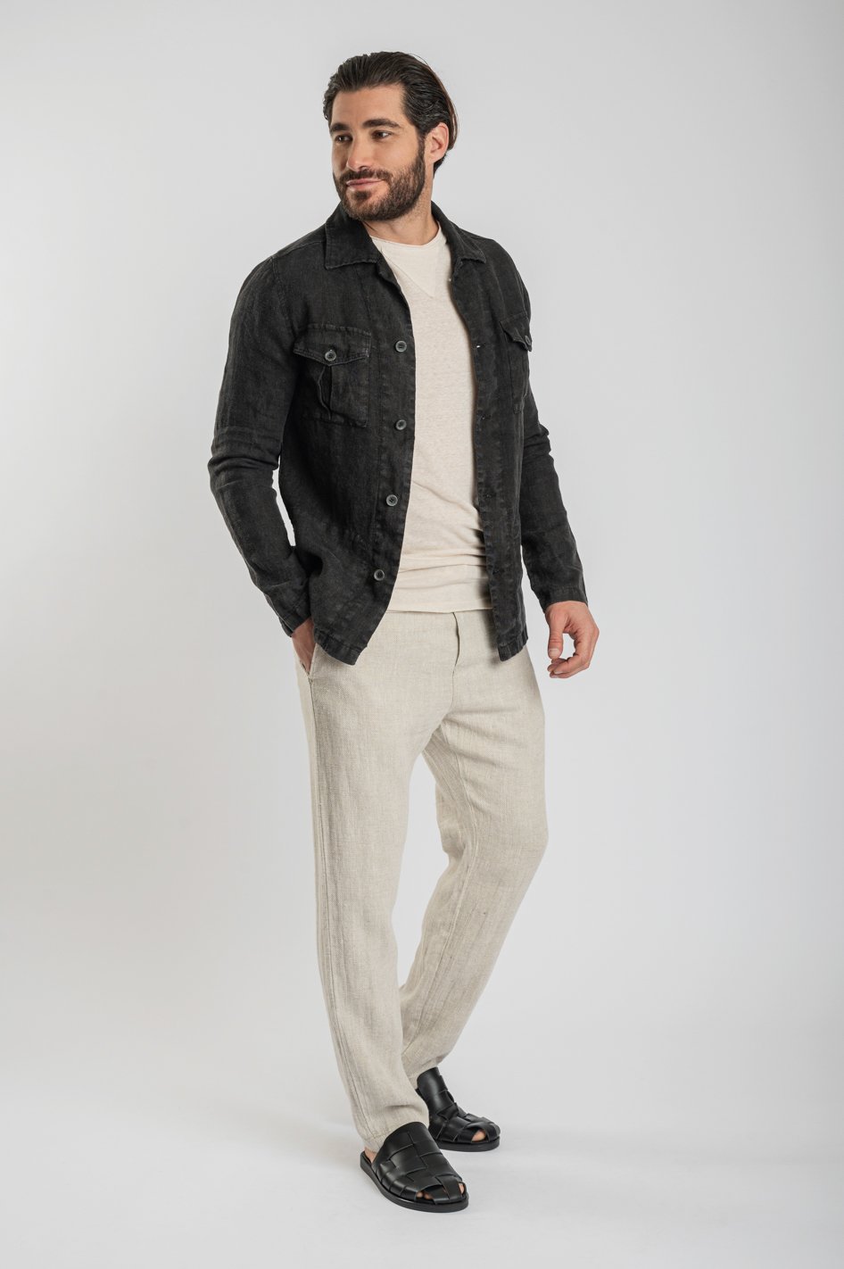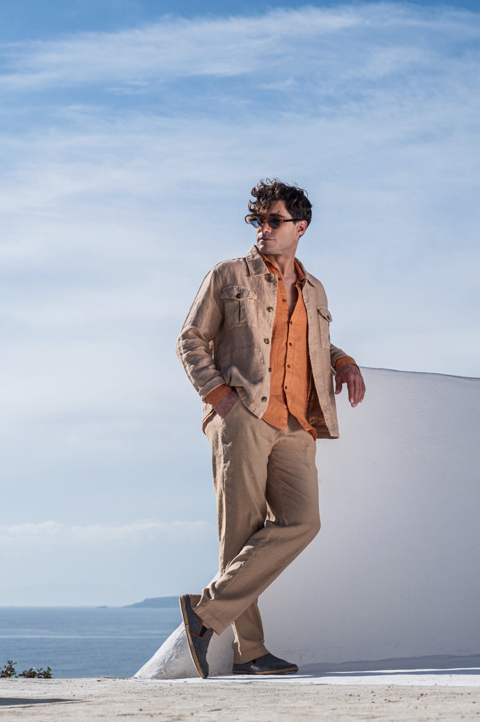This linen jacket features a lightweight construction with a classic button front and functional pockets. The breathable fabric and comfortable silhouette make it ideal for warm-weather wear, offering a refined yet casual style. Perfect to layer over shirts or tees for everyday or vacation looks.