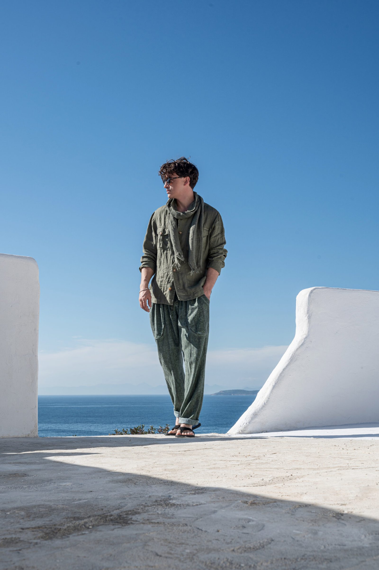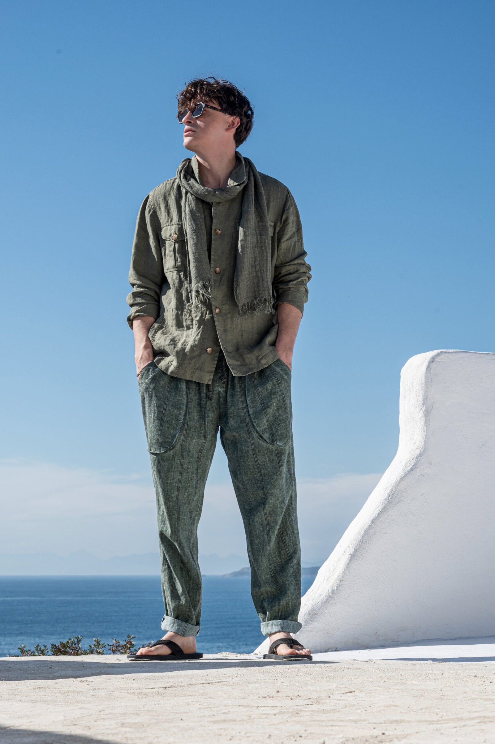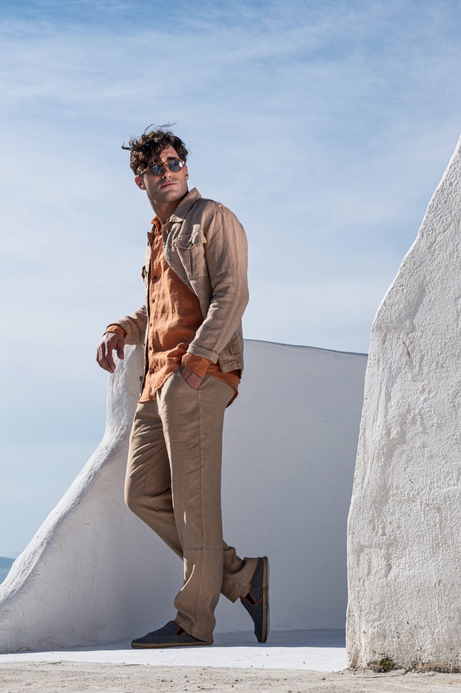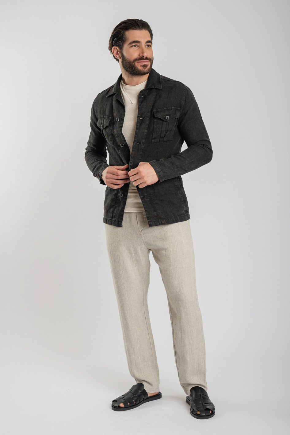 This linen jacket features a lightweight construction with a classic button front and functional pockets. The breathable fabric and comfortable silhouette make it ideal for warm-weather wear, offering a refined yet casual style. Perfect to layer over shirts or tees for everyday or vacation looks.